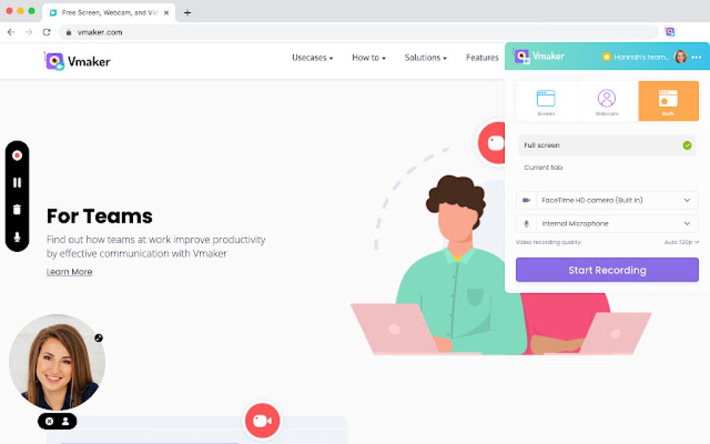 - Vmaker revolutionises video conferences without a chat. an application that records video from both the webcam and the screen at the same time. Increase productivity while improving communication with clients, employees, and other stakeholders. Important differences Video recording in up to 4K resolution; One-click conversion of any screen capture to a video; A scheduler, the capability to record meetings and webinars beforehand, screen annotation, mouse emphasis, and screen blur out tools, as well as brand protection, are all excellent editing features.