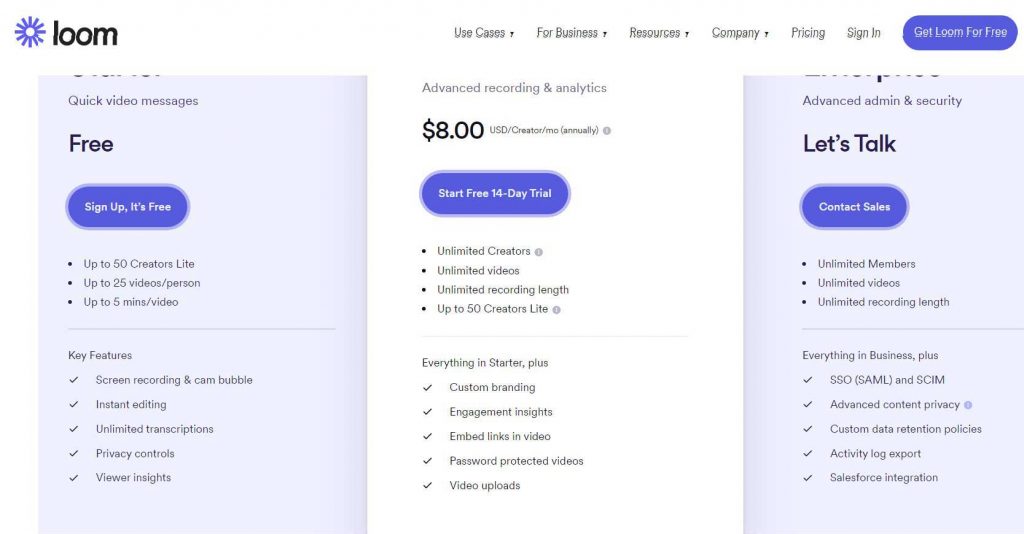 The Education and Business plans also include extra features and tools in addition to those included with Loom’s free Starter plan.