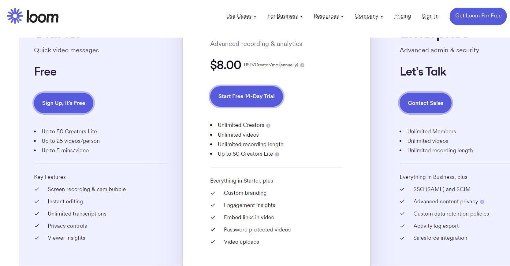 All of the features offered on Loom’s Starter plan are also available on the Business and Enterprise levels.