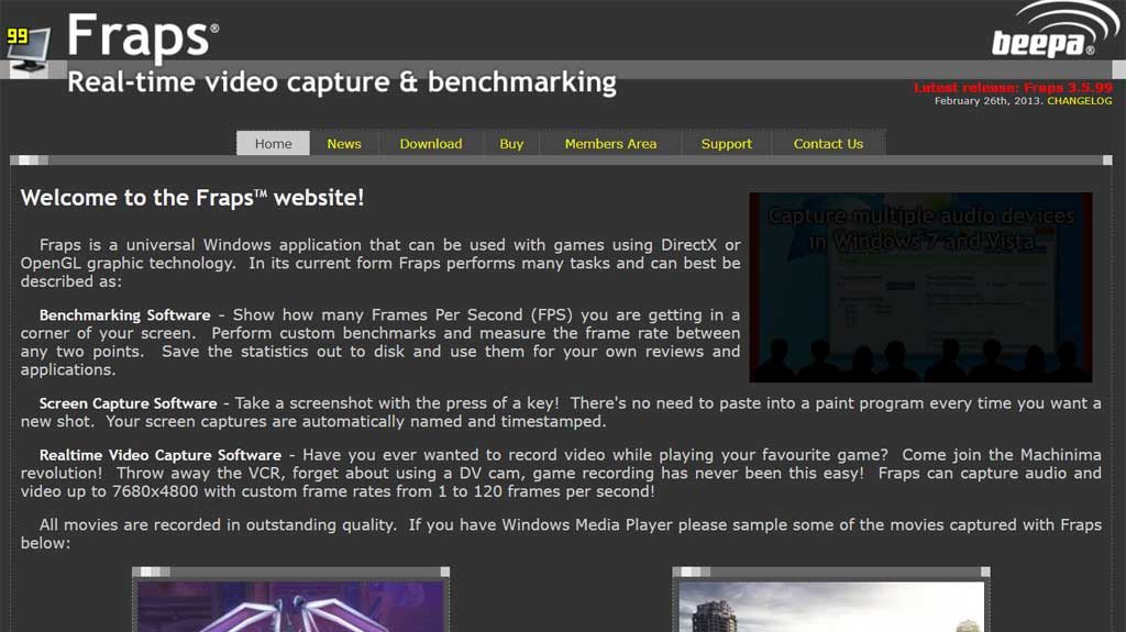 - The all-purpose Windows software Fraps can be used with games that use DirectX or OpenGL graphics. In its current form, Fraps performs a number of functions and is best described as: Using benchmarking software, display the number of frames per second (FPS) you are getting in a corner of your screen. Using customised benchmarks, calculate the frame rate between any two places. After storing the statistics to disc, use them for your own reviews and applications. With screen capture software, take a screenshot simply hitting a key! To make a new photo, you don't always have to paste it into a paint programme. Your screen captures are time-stamped and named automatically.