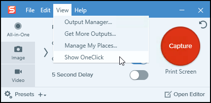 Step 7: You can enable one click by selecting view and show one click.Then you can move the one click capture window anywhere on your screen by clicking and dragging.